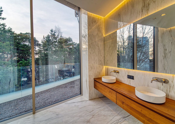 Facade of the building is characterized by curved tempered glass balcony railings, use of natural travertine facade cladding, which were individually carved from solid blocks of natural stone and installed on site. Building features sliding curtain windows with curved sections as well as unique curved internal courtyard with curved sliding glass facade. On rooftop a unique sliding aluminium/glass canopy of 12m span is installed above 20m swimming pool.